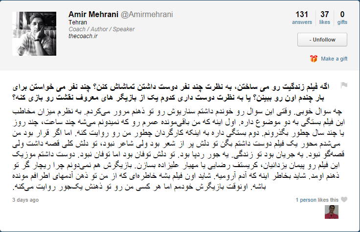 دیروز از امیر مهرانی، مَردِ خُوشفکر این دوره زمونه، اون سوال معروفم رو در ask.fm پرسیدم. از شما هم میپرسم:
